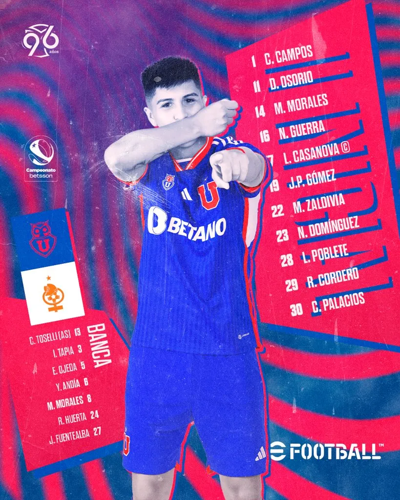 Ante esta situación la formación de la U será con Cristóbal Campos en el arco; Matías Zaldiva, Nery Domínguez, Luis Casanova en la defensa; Juan Pablo Gómez, Israel Poblete, Renato Cordero, Darío Osorio, Marcelo Morales en la zona de volantes; Nicolás Guerra y Cristián Palacios en delantera.