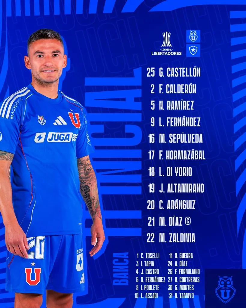 El Chuncho formará contra Botafogo con Gabriel Castellón en el arco; Nicolás Ramírez, Franco Calderón y Matías Zaldivia en defensa; Fabián Hormazábal, Marcelo Díaz, Charles Aránguiz, Matías Sepúlveda; y Javier Altamirano en mediocampo; Leandro Fernández y Lucas Di Yorio en ataque.