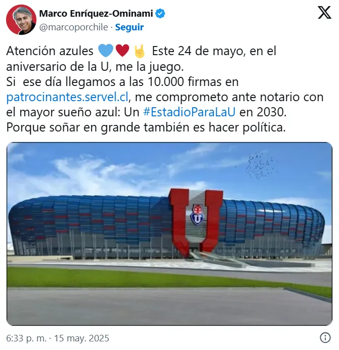 El destacado periodista nacional agregó que “Ominami iba siempre al estadio con Marco Enríquez, siempre han sido de la U. Y ahora que necesita las firmas para la candidatura se la jugó toda. Pensó: si el 24 de mayo es el aniversario de la U me la juego. Y publicó: si ese día llegamos a las 10 mil firmas me comprometo ante notario con el mayor sueño de la U… un estadio para el 2030″.
