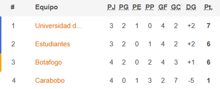 Con el triunfo, Estudiantes trepa al primer lugar de la tabla con 9 puntos, mientras Universidad de Chile queda segunda con 7 unidades, seguida de Botafogo (6) y Carabobo (1).