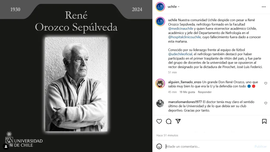 Así mismo, la casa de estudios de Universidad de Chile también despidió a uno de los suyos: “nuestra comunidad Uchile despide con pesar a René Orozco Sepúlveda, nefrólogo formado en la Facultad de Medicina de Universidad de Chile y quien fuera vicerrector académico de la U, académico y jefe del Departamento de Nefrología en el Hospital Clínico de Universidad de Chile, cuyo fallecimiento fuera dado a conocer esta mañana”.