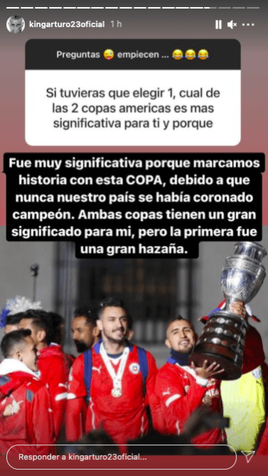 A través de su cuenta de Instagram, Vidal realizó una serie de respuestas a preguntas de sus fanáticos y donde reveló varios detalles inéditos de su carrera. Desde reconocer su soltería hasta su ídolo mentalmente hablando en el fútbol fueron parte de las más honestas declaraciones del bicampeón de América.