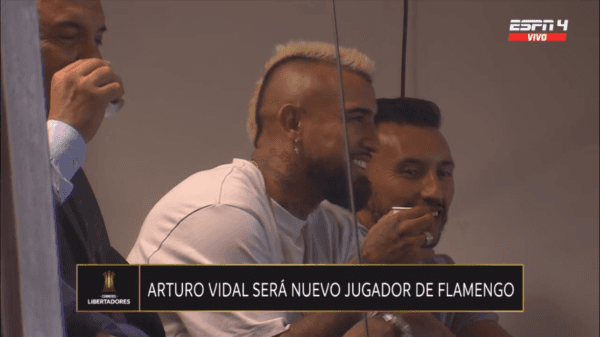 Las cámaras de la transmisión de ESPN captaron a Vidal entre el público del duelo del Fla contra Tolima por la revancha de los cuartos de final de la Copa Libertadores. Lo mismo sucedió con los flashes de las agencias de fotos, con la presencia del inminente refuerzo del Mengao como gran noticia.