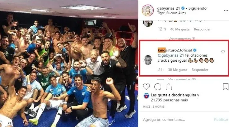 Arturo Vidal sí estuvo pendiente del título de RacingClub en Argentina, elenco que se coronó anoche en la Superliga con la presencia de tres chilenos: Gabriel Arias, Eugenio Mena y MarceloDíaz. Aunque el King solo le dejó mensaje al primero de ellos en Instagram.
