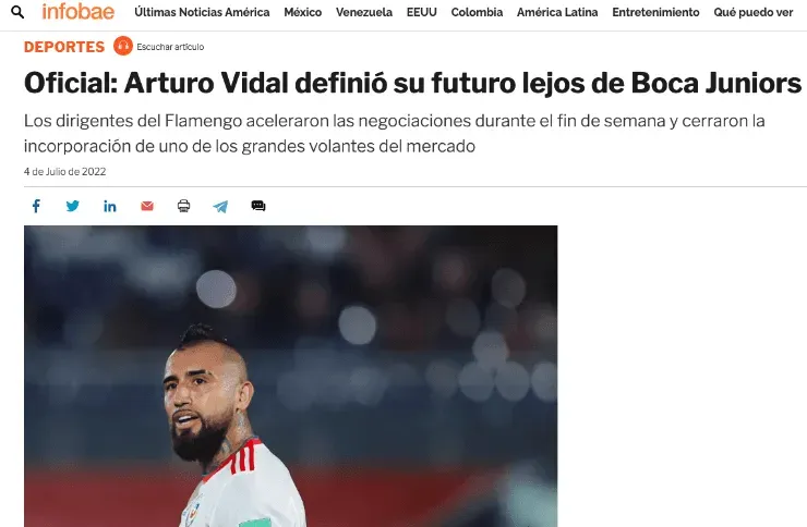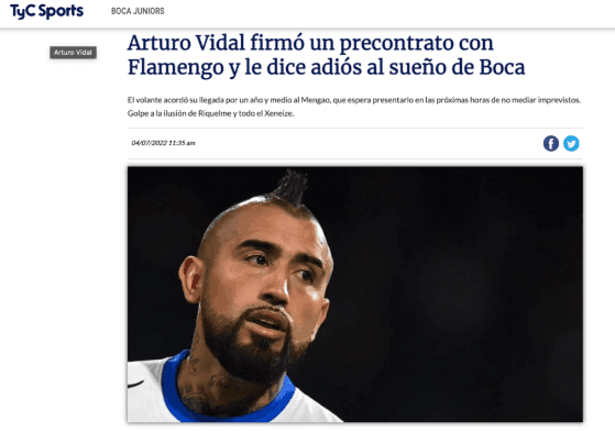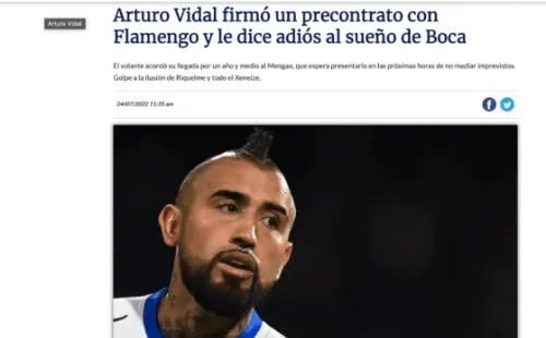 Por otro lado, en Infobae optaron por abordar el tema solo desde lo formal. “Flamengoacordó contratar este fin de semana al chilenoArturo Vidal. Tras acercarse aBoca Juniors, la directiva rojinegra decidió acelerar las negociaciones con el chileno de 35 años y se llegó a un buen puertogracias a un ofrecimiento de un contrato válido hasta diciembre de 2023″.