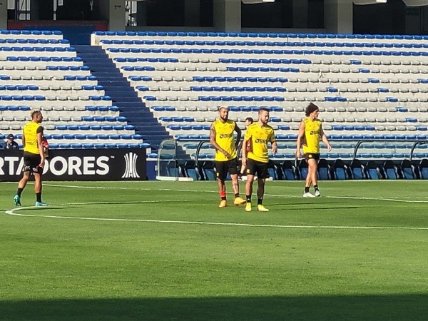 Con un vendaje rojo en el tobillo derecho, la zona afectada, participó en uno de los grupos más importantes del rondo que se realiza para comenzar a calentar el cuerpo antes de los ejercicios más exigentes que dispone el cuerpo técnico.
