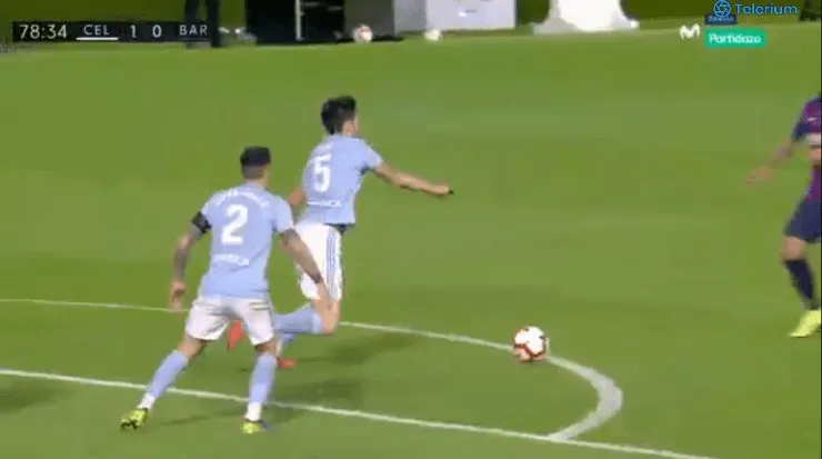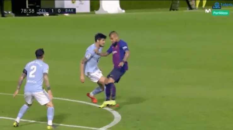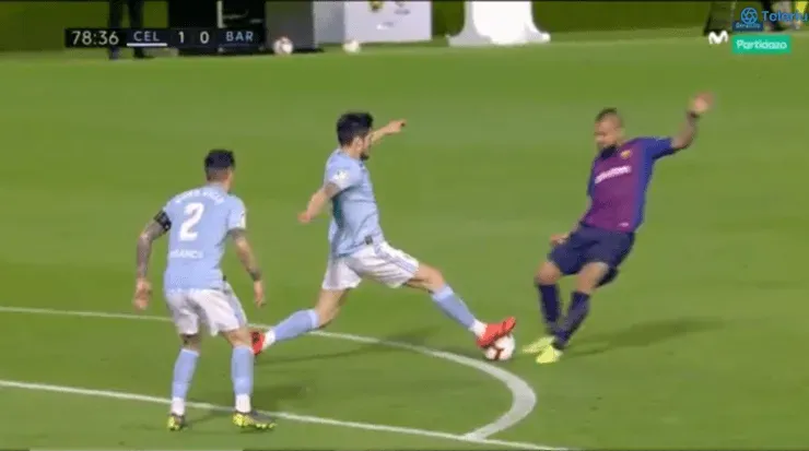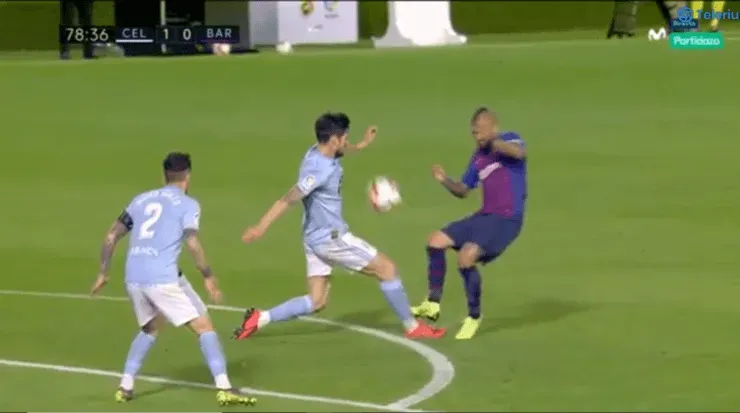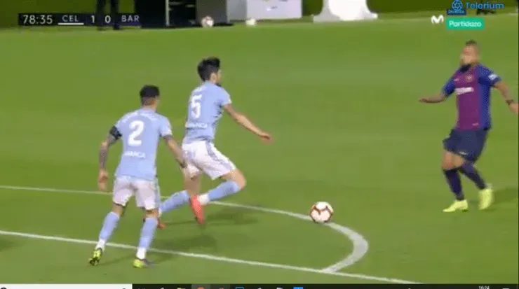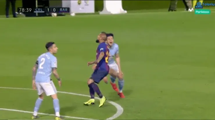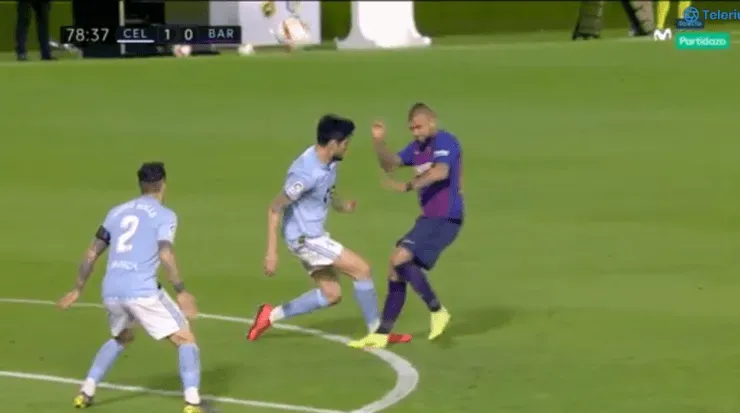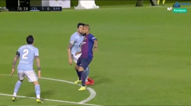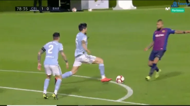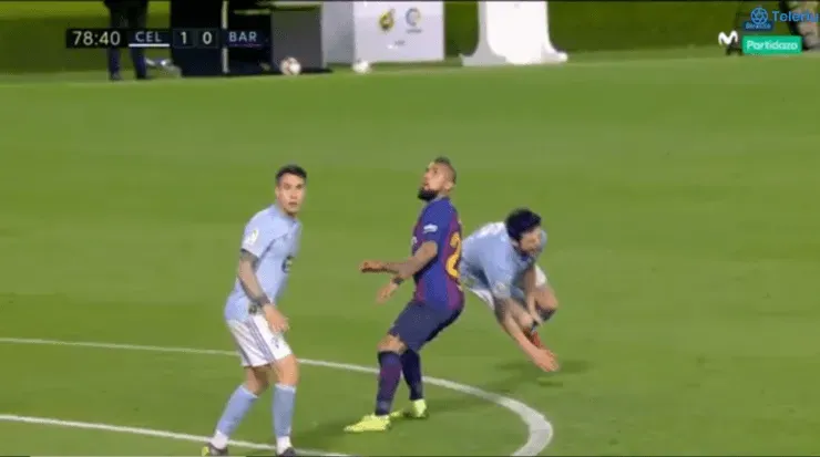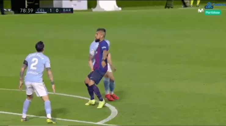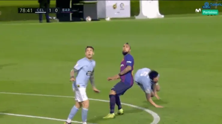 El jugador chileno fue al ataque y en un disparo al arco rival, se dio un confuso incidente que terminó con Vidal amonestado: un remate del King fue trabado por un zaguero del Celta, pero el valor nacional igual alcanzó a rematar. El rival se lanzó y el árbitro consideró que fue juego peligroso.