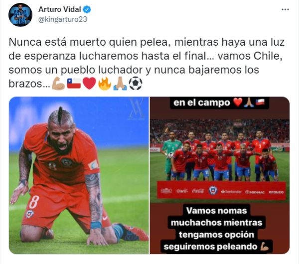 El King, quien volverá a la nómina para los compromisos de marzo ante Brasil y Uruguay, se mostró optimista a pesar que el escenario es bastante adverso.”Vamos Chile, somos un pueblo luchador y nunca bajaremos los brazos”, señaló.