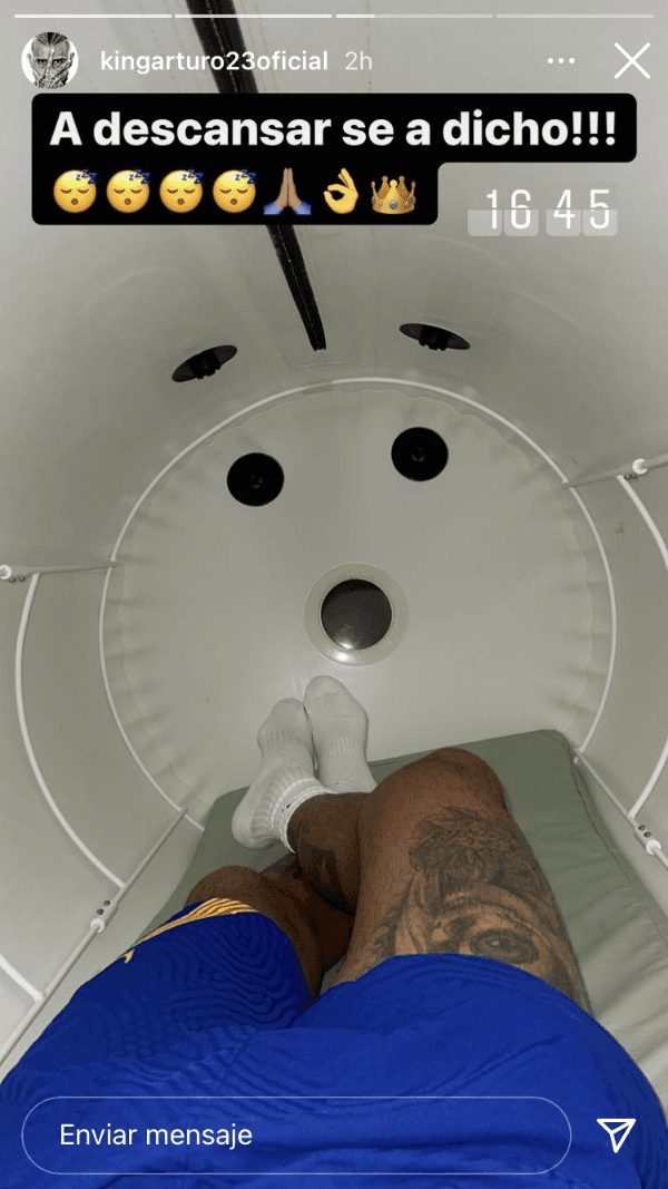 Es por ello que el propio Vidal intentó calmar los ánimos a través de sus redes sociales, donde mostró su rehabilitación. En su cuenta de Instagram, el volante chileno publicó imágenes dentro de una cámara de recuperación, dejando en claro que está haciendo lo posible por llegar a la triple fecha que viene.