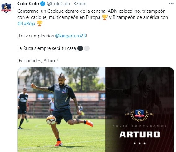 Otro que no podía quedar ausente fue Colo Colo, que publicó en Twitter “canterano, un cacique dentro de la cancha, ADN colocolino, tricampeón con el Cacique, multicampeón en Europa y bicampeón de América con la Roja. Feliz cumpleaños, King Arturo. La Ruca siempre será tu casa. ¡Felicidades, Arturo!”.