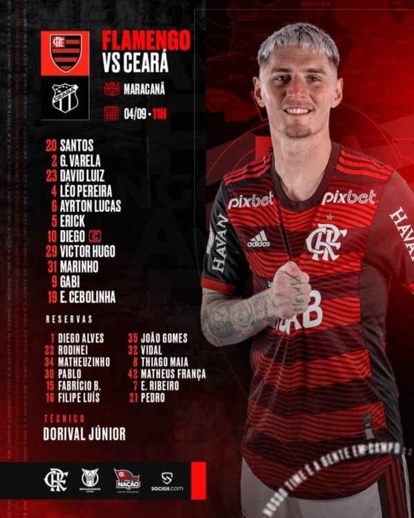 De esta forma, el Mengao enfrentará al Ceará con una formación compuesta por Santos; Guillermo Varela, David Luiz, Leo Pereira, Ayrton; Diego, Erick Pulgar, Víctor Hugo; Marinho, Gabigol y Everton Cebolinha.
