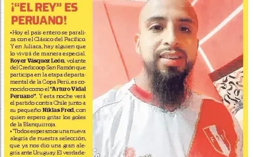 Se trata del jugador Royer Vásquez León, conocido como “el Arturo Vidal peruano”, que juega en el Credicoop San Ramón de Juliaca, en la fase departamental de la Copa Perú. El volante no tuvo ni un empacho en quedarse con el nombre del original.