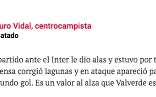 “Vidal ha dado otro paso más al frente. Hoy no solo ha sido ese futbolista que contagia al resto del equipo en la presión; también ha tenido presencia destacada en el juego ofensivo. Habitualmente se le valora que ‘revoluciona’ al equipo; hoy hemos visto su otra ‘revolución’, su aportación en ataque“, señala la publicación.