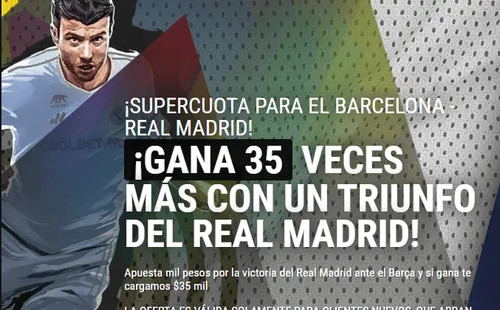 Juega la Supercuota que te ofrece Coolbet, elegida la Mejor Casa de Apuestas del Mundo, para el partido entre Barcelona vs Real Madrid. Abre tu cuenta en Coolbet y apuesta mil pesos por el triunfo de Real Madrid, y si los merengues ganan, te cargan $35.000. Además puedes aprovechar la opción “invita a un amigo”, y recibirás una recompensa por cada amigo que se registre, deposite o complete los requisitos de apuesta del bono de bienvenida.