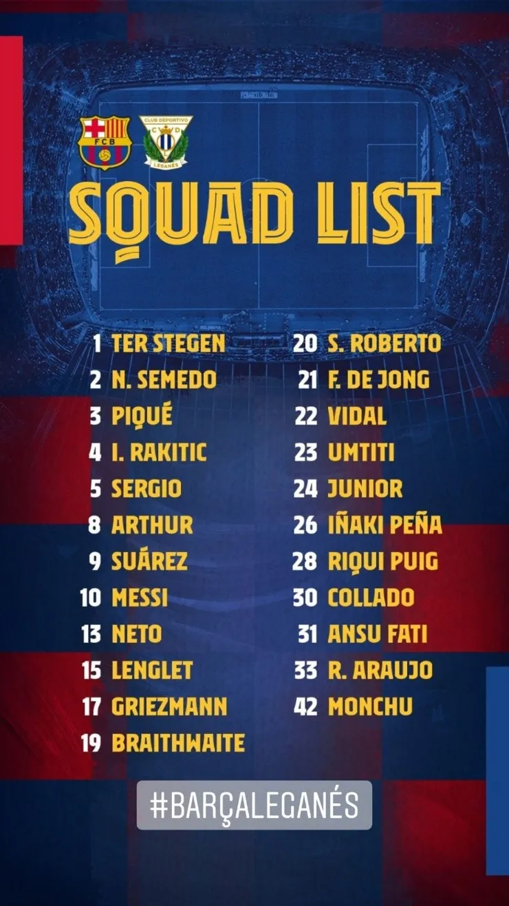 La lista de 23 citados la integran Marc André ter Stegen, Nelson Semedo, Gerard Piqué, Iván Rakitic, Sergio Busquets, Arthur, Suárez, Messi, Neto, Clement Lenglet, Antoine Griezmann, Martin Braithwaite, Sergi Roberto, Frenkie de Jong, Vidal, Umtiti y Junior Firpo.