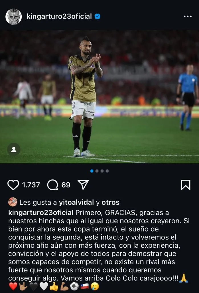 Fue en las plataformas digitales de Arturo Vidal donde publicó un mensaje a todos Colo Colo, primero dando muestras de cariño por el gran apoyo recibido en estos días de competencia internacional.