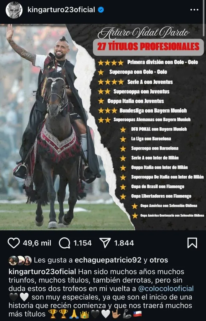 Fue en sus plataformas digitales donde Arturo Vidal celebró ser el chileno con más títulos de la historia, lo que no dejó pasar el King en su Instagram con una espectacular imagen.