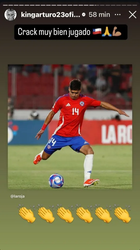 “Crack, muy bien jugado”, escribió el King en su Instagram personal, donde acompañó una fotografía del jugador de Universidad de Chile en el Estadio Nacional.