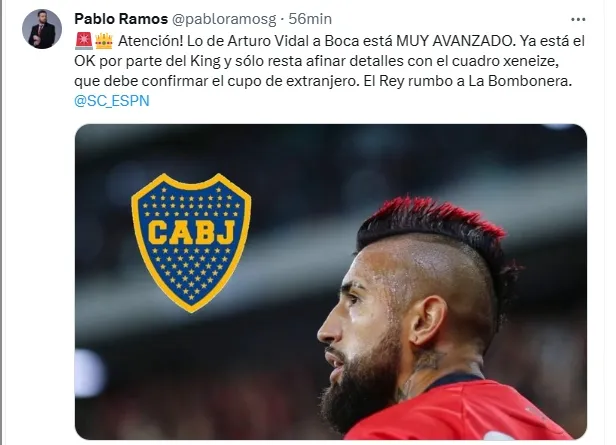 “¡Atención! Lo de Arturo Vidal a Boca está MUY AVANZADO. Ya está el OK por parte del King y sólo resta afinar detalles con el cuadro Xeneize, que debe confirmar el cupo de extranjero. El Rey rumbo a La Bombonera”, detalló en sus redes sociales.