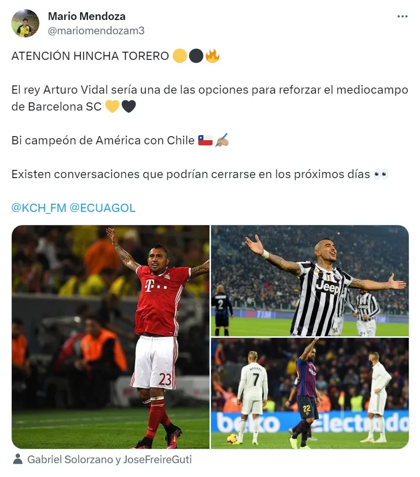 A esta versión, se suma la descrita por Mario Mendoza, reportero del portal Ecuagol, quien posteó en su red social que “El rey Arturo Vidal sería una de las opciones para reforzar el mediocampo de Barcelona SC… Existen conversaciones que podrían cerrarse en los próximos días“.