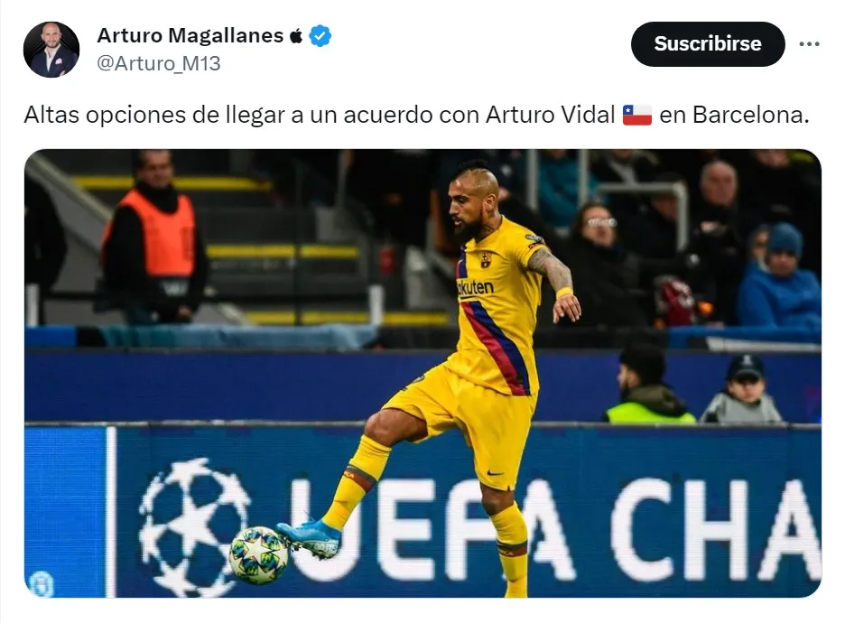 El periodista Arturo Magallanes, de la cadena internacional GolTV, escribió en su cuenta de Twitter que “altas opciones de llegar a un acuerdo con Arturo Vidal en Barcelona“, equipo que terminó en el segundo puesto en la LigaPro de ese país.