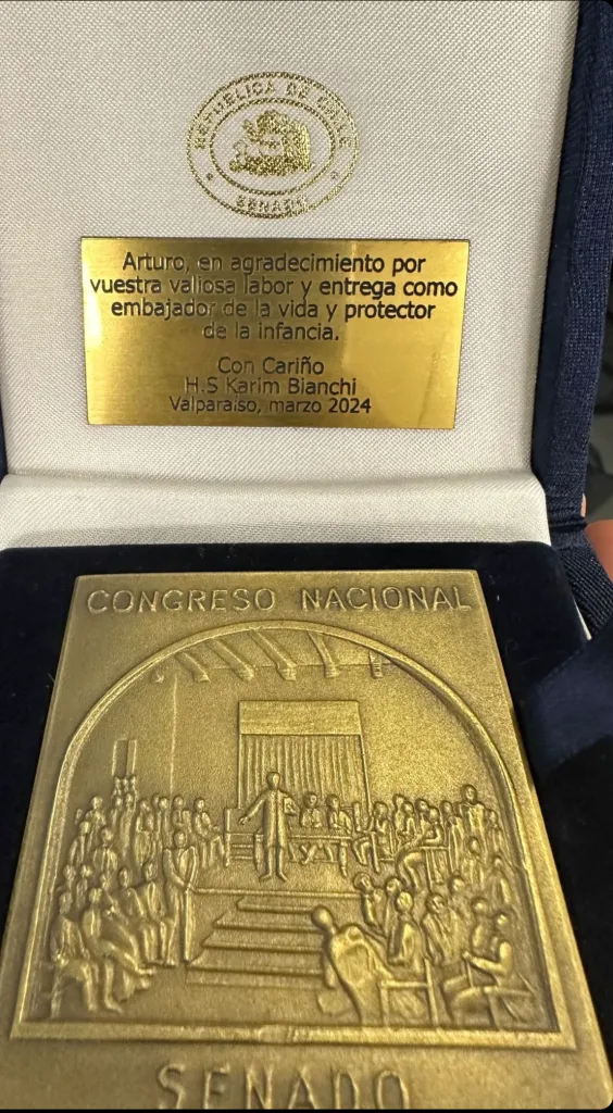 “Arturo, en agradecimiento por vuestra valiosa labor y entrega como embajador de la vida y protector de la infancia”, se puede leer en un mensaje que tiene su reconocimiento.