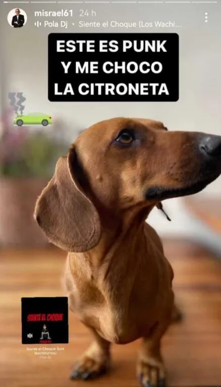 Segundos después en el Story compartió una foto de su perro de raza dachshund: “este es punk y me chocó la Citroneta”, dijo Israel irónico en referencia al mohicano y el apodo de Celia Punk de Arturo Vidal. Y claro, por el recordado incidente del choque de su Ferrari, en estado de ebriedad, en plena Copa América de 2015.