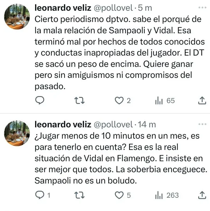 “¿Jugar menos de 10 minutos en un mes, es para tenerlo en cuenta? Esa es la real situación de Vidal en Flamengo. E insiste en ser mejor que todos. La soberbia enceguece. Sampaoli no es un boludo”, comenzó explicando.
