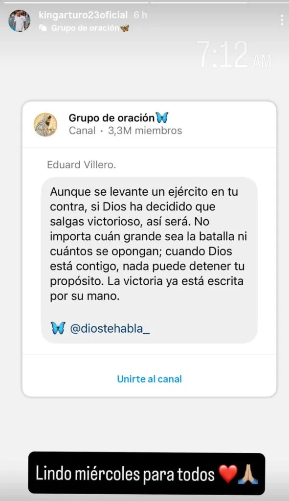 Dentro de ese canal de Grupo de Oración, el King eligió la frase que parte diciciendo “Aunque se levante un ejército en tu contra, si Dios ha decidido que salgas victorioso, así será.