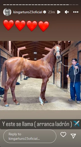 Claramente la situación no agradó para nada al King, quien decidió responder a través de su arma más recurrente: las redes sociales. A través de Instagram, el bicampeón de América compartió numerosas fotos de sus caballos y el campo donde mantiene a los animales, negando así la información de Israel. La secuencia finalizó con la imagen de uno de los ejemplares, donde Vidal indicó: “este se llama Arranca Ladrón”, junto al emoji de un avión.